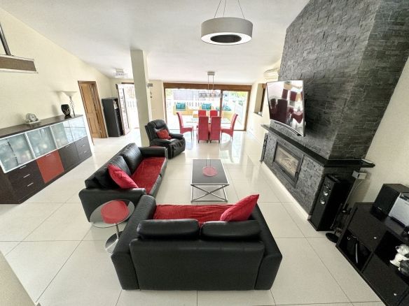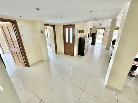 You enter this modern luxury finca via an entrance hall that quickly opens up to a good size entrance lobby area, which is open plan to a spacious lounge / dining area. The spacious and bright lounge / dining room has a high half vaulted ceiling, lots of windows and large 3 door double glazed patio doors opening onto the very large terrace area which has both covered and open sunny areas overlooking the grounds. This open plan living area also has a large feature fire place with log burner and stairs to a mezzanine landing. Large high gloss modern fitted kitchen with centre island and dark granite work tops. The kitchen has plenty of wall and base units, sink, oven, second oven / microwave with plate warmer below, large hob with ceiling mounted hood above, integrated freezer, dishwasher, concealed washer/ dryer and a large American style fridge freezer. The kitchen also has, in ceiling spot lights, a large opening to the lounge / diner for a modern social lifestyle, DG window to front and glazed door to rear BBQ & entertaining area. Master bedroom with DG window and patio doors to side terrace, fitted wardrobe and modern en-suite luxury shower room. Bedroom 2 has DG window and patio doors to side terrace, fitted wardrobe and ladder to a mezzanine guest bed area 4. Bedroom 3 has DG window and patio doors to rear terrace with fitted wardrobe. Second bathroom with 2 (jack & jill style) entrances, double sink unit, bath with shower over, W.C and electric opening skylight in roof. The mezzanine landing from the lounge has low pitched ceiling (currently with home office area) and access to both the (low ceiling) guest bed 4 area (open plan to bedroom 2) and separate (low ceiling) guest bedroom 5. The property also benefits from air conditioning. The kitchen, hall, living room, dining room, main bedroom & ensuite all have underfloor heating.