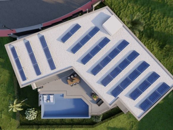 For added convenience, there is an outdoor bathroom available in the pool area. The upper floor hosts three bedrooms, each with its own bathroom, ensuring privacy and comfort for all residents. Additionally, the villa features cutting-edge energy efficiency features such as underfloor heating and aerothermal, along with solar panels for maximum energy savings.