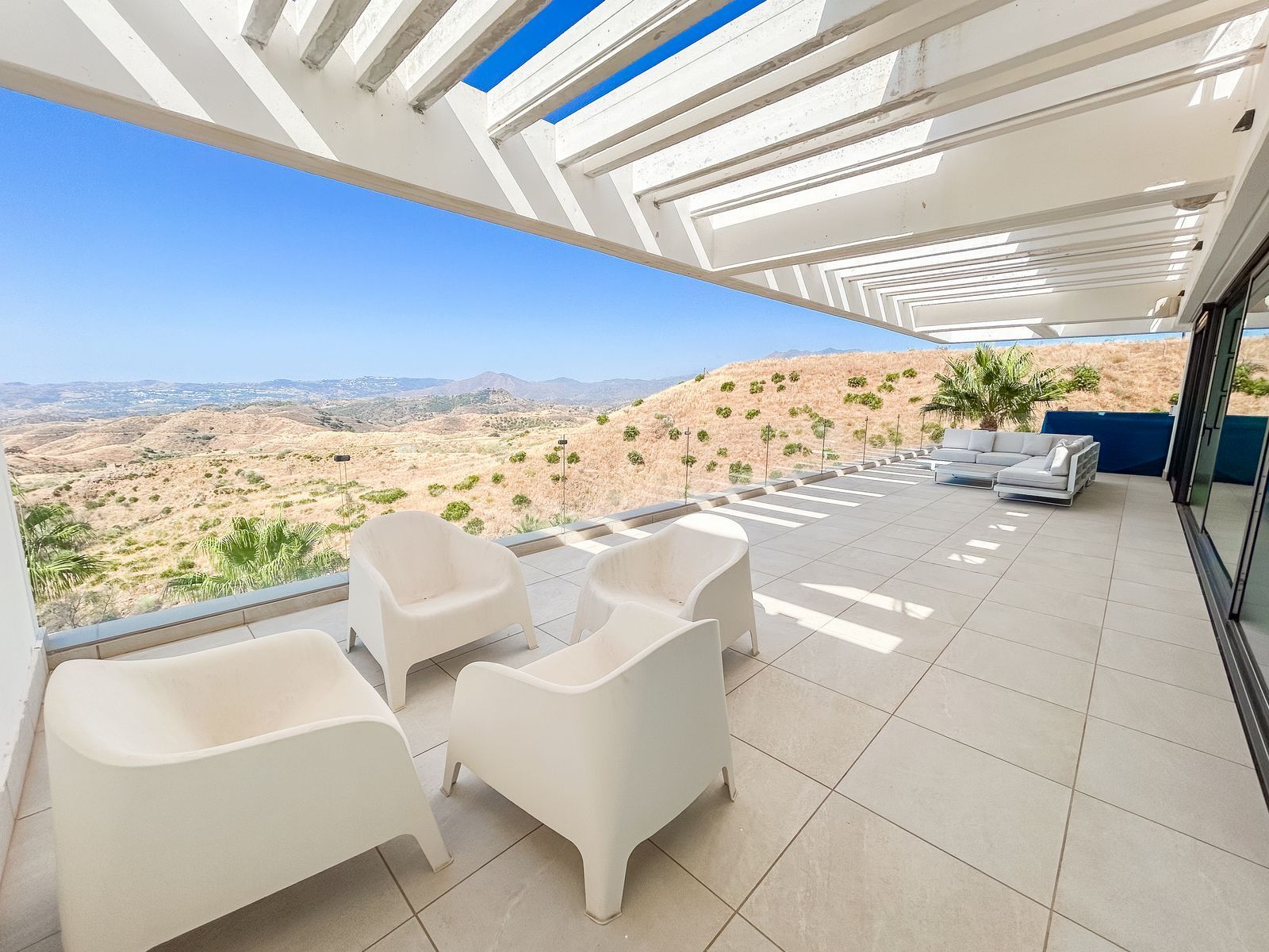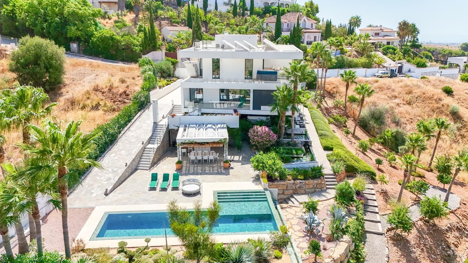 Built on a generous plot of 1,718 m², the property offers a total area of 312 m², distributed over three levels that combine functionality, design and warmth. With a privileged south and west orientation, the villa opens up to unrivalled panoramic views that encompass the Mijas valley, the majestic mountains and the blue Mediterranean Sea.