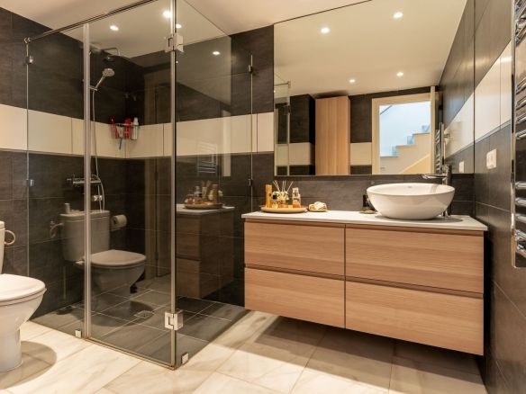 An elegant marble staircase leads down from the living room to the apartment’s three bedrooms and two bathrooms, all designed with modern comfort and high-quality finishes.