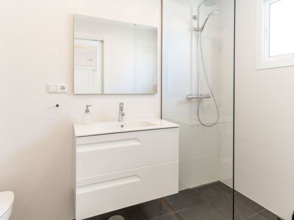The apartment features a welcoming entrance hall, a spacious and bright living room with a guest toilet, storage room, and a stylish kitchen. From the living room, you have direct access to a fantastically spacious terrace, divided into several inviting zones: a lounge area, outdoor kitchen, open-air shower – and space to install a jacuzzi. The entire terrace offers **spectacular panoramic sea views**, perfectly completing the experience of authentic southern Spanish living.