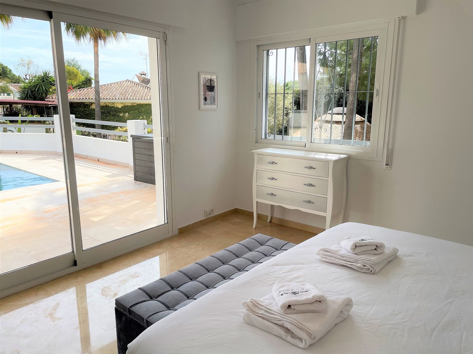 * Main house: 4 spacious double bedrooms and 3 full bathrooms on one level (approx. 230m2), with direct access to the pool from 3 bedrooms, without any steps!