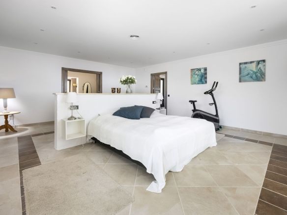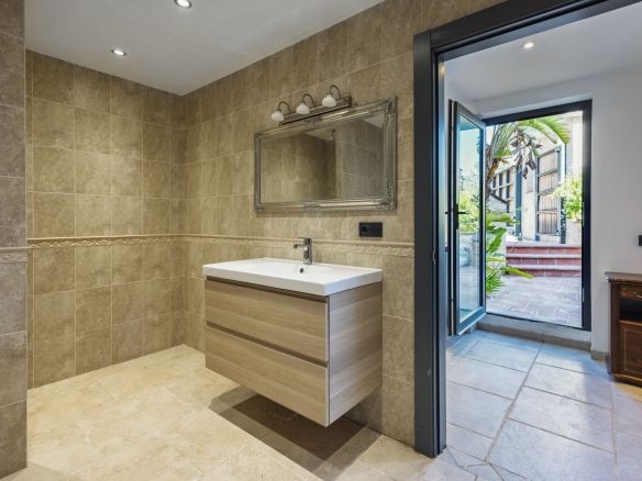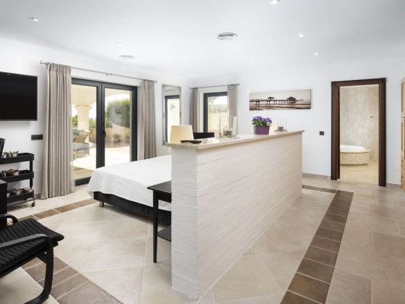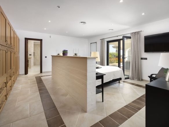On the ground floor, a grand entrance hall with guest WC leads into a vast open-plan dining and living area. To one side is a fully fitted modern kitchen with high-end appliances including two ovens, two fridges, two freezers, induction cookers, dishwasher, microwave, and a special tap for filtered drinking water, with direct garden access. On the other side, patio doors open to a large terrace with glass curtains, perfect for enjoying sunrise and sunset year-round. The elegant living room features coloured LED ceiling lighting, direct terrace access, and a lift to the rooftop jacuzzi. The master suite on this floor boasts a wraparound terrace, a luxurious walk-in closet with central island, and an en-suite bathroom with balcony—ideal for soaking in a hot bath while watching the sun set over the Andalusian hills.