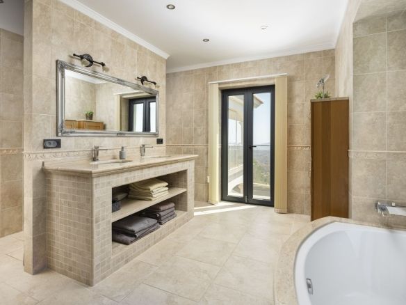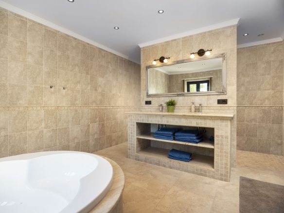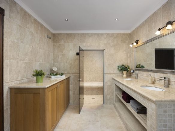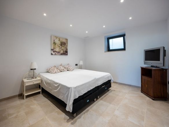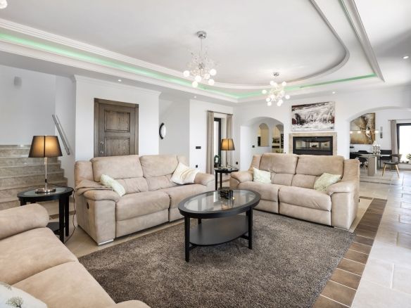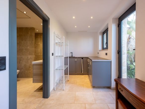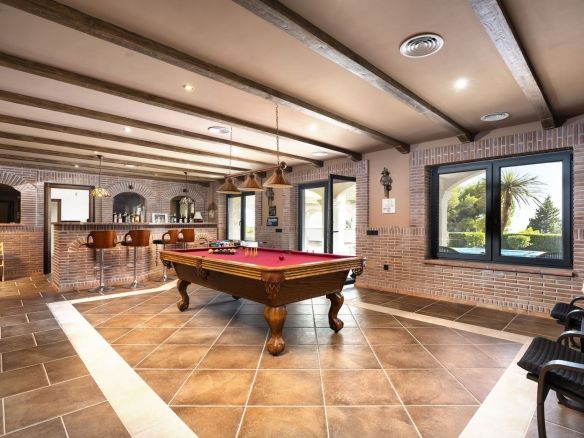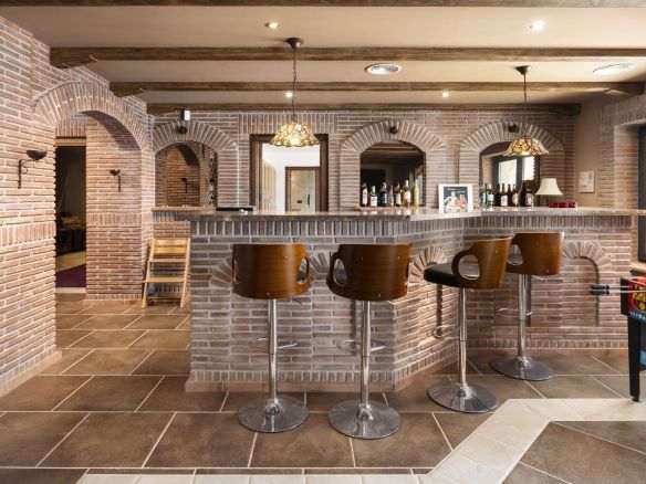 The lower level, accessible by stairs or lift, includes a second spacious living area with rustic bar, wine shelving, and billiard table, two generous en-suite bedrooms with garden and pool access (one with Turkish bath), a guest WC, large laundry room with kitchenette and storage, and a cinema room with surround sound and theatre seating.