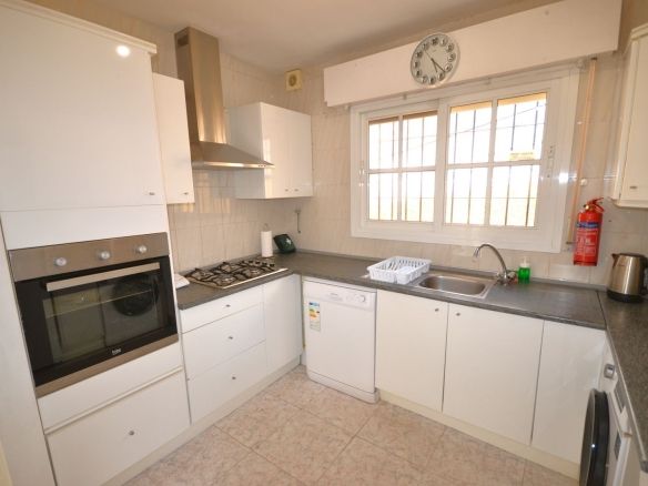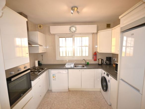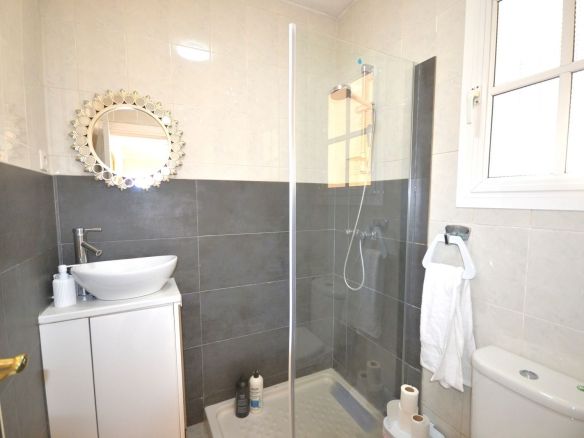 Accessed via an electric gate, the private driveway leads to a one-car garage plus open parking for two additional vehicles. The welcoming porch with a cosy seating area opens into the main hallway, where you’ll find a guest bathroom with shower to the right, a fully fitted kitchen to the left, and a spacious living room straight ahead. The living room features an enclosed terrace, offering an extended, versatile space perfect for year-round use.