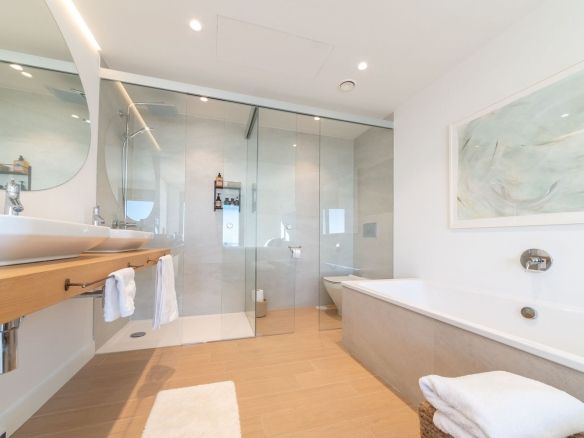 The main floor features a spacious living room and an open-plan kitchen, perfect for sharing unforgettable moments with friends and family. The wood-burning fireplace adds a cozy touch to your evenings. The large terrace is the perfect place to enjoy al fresco dining while taking in the breathtaking views. A guest toilet is also located on this floor.