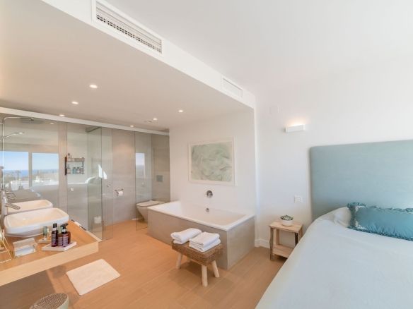 Upstairs, you'll find three bedrooms, including a master suite with a private bathroom featuring a shower and bathtub. The other two bedrooms share an additional full bathroom. Two of the bedrooms have access to another large terrace, perfect for soaking up the sun and enjoying the views.