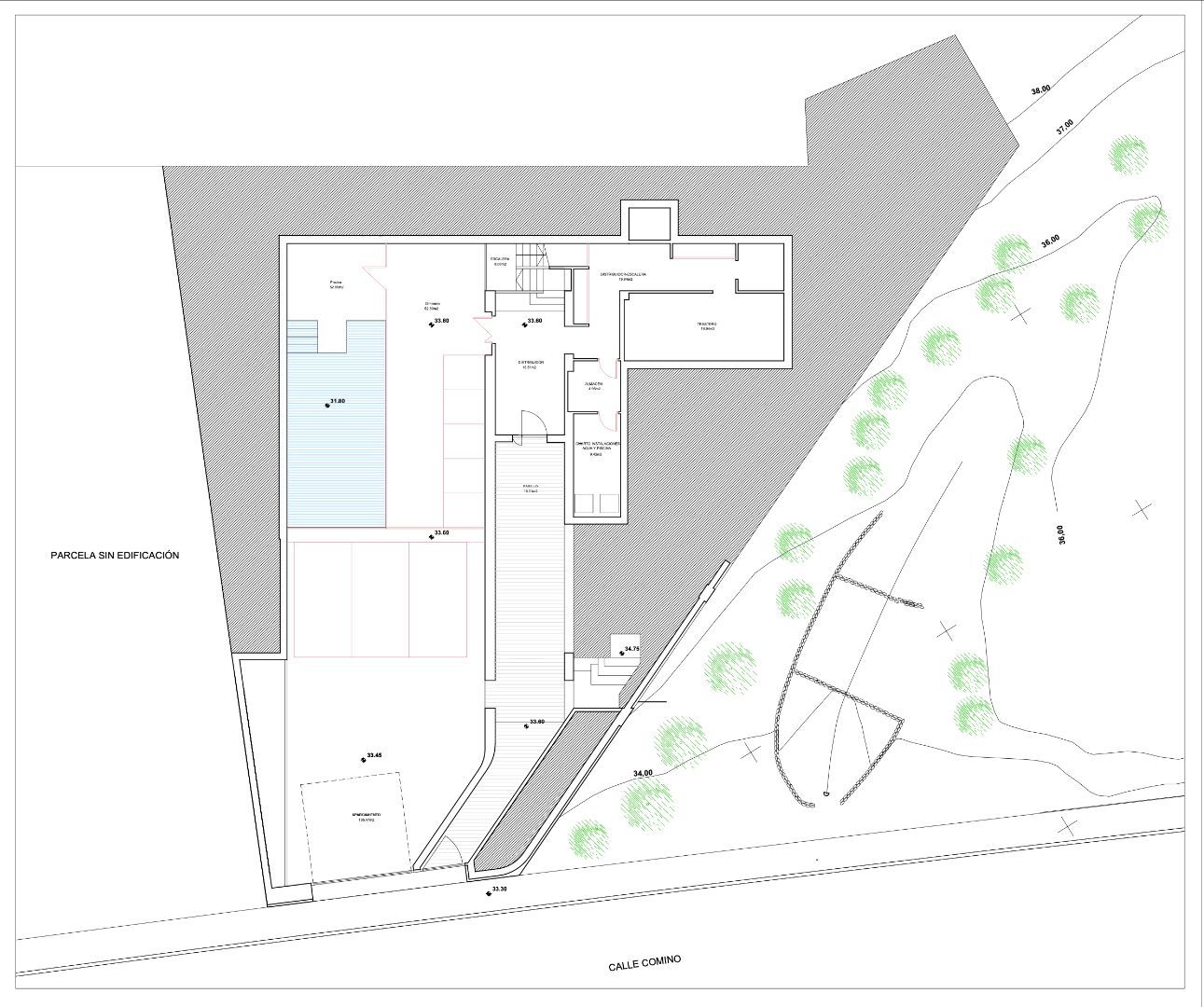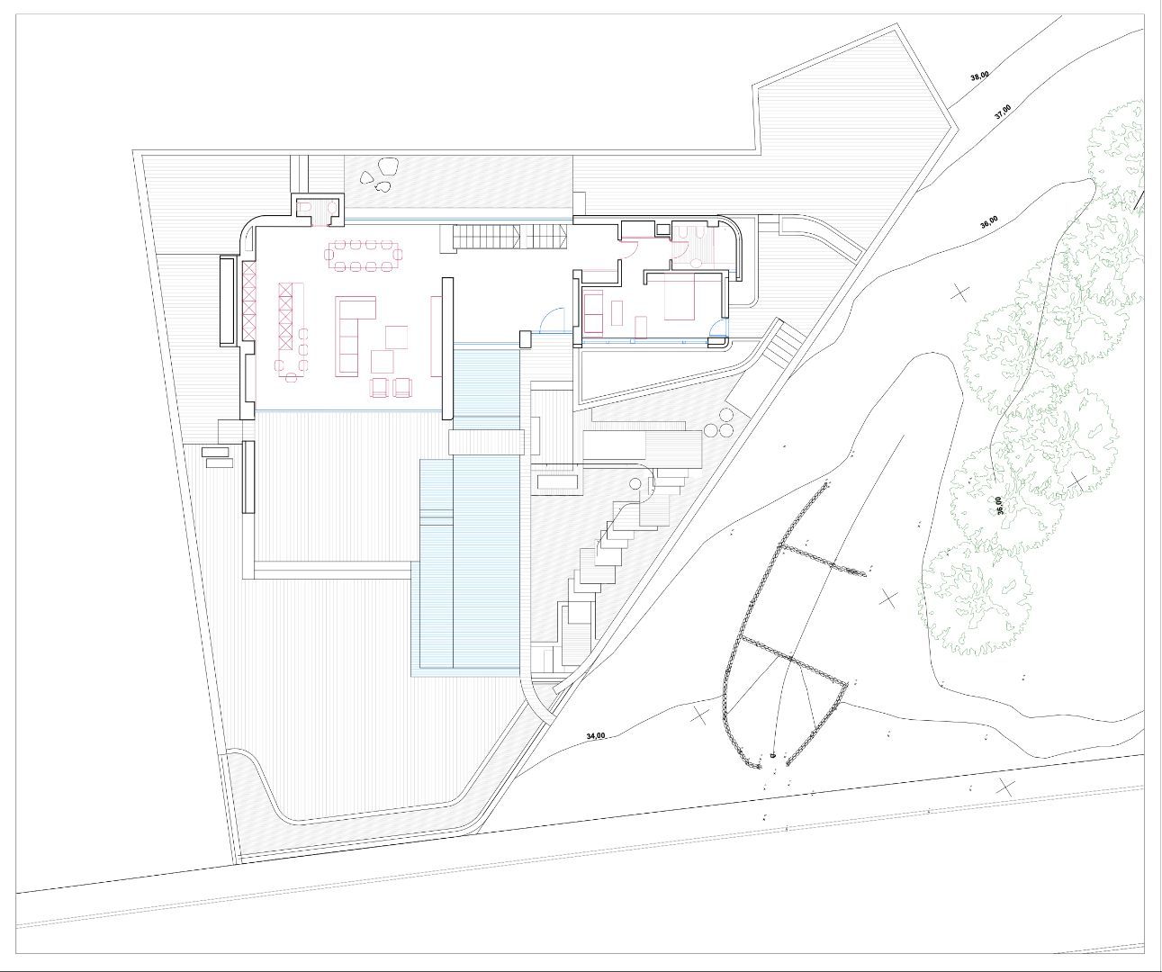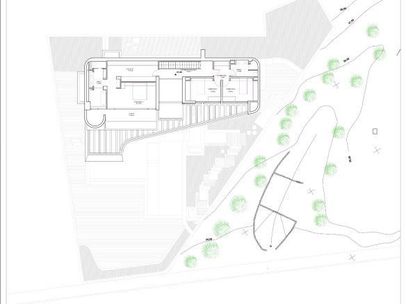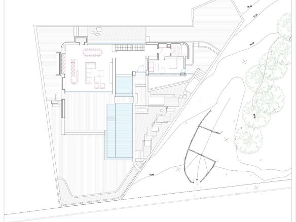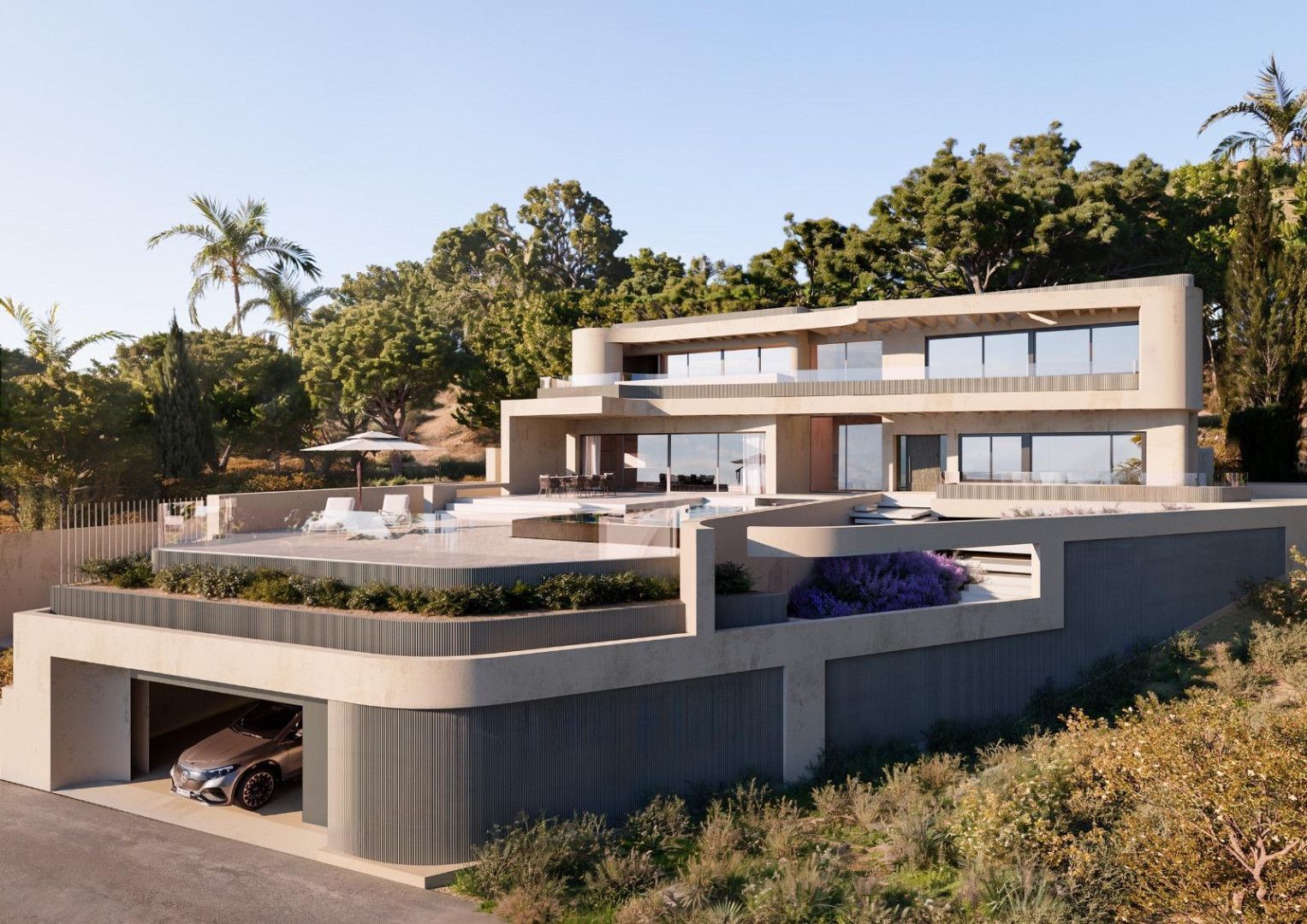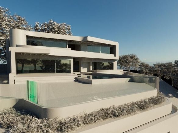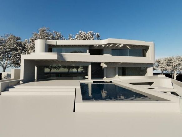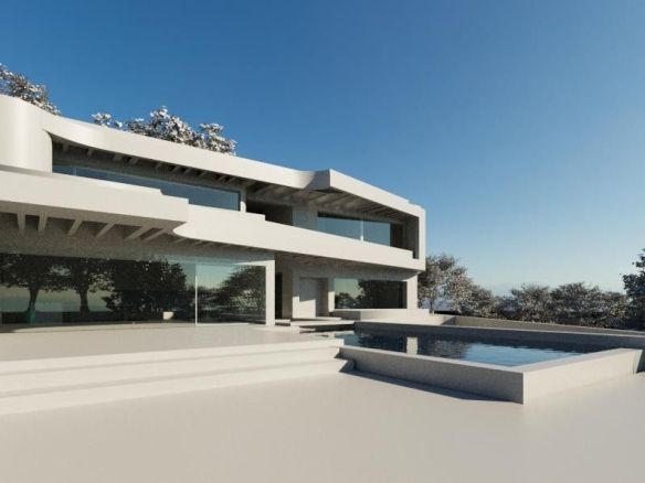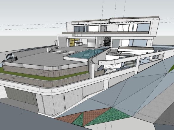 The proposed design features a three-level contemporary villa with floor-to-ceiling glass walls that open to panoramic views. The plan includes a large open living area, four bedrooms, a sleek kitchen, a private gym, an indoor pool, and multiple terraces. Every space is designed to bring in natural light and connect seamlessly with the outdoors.