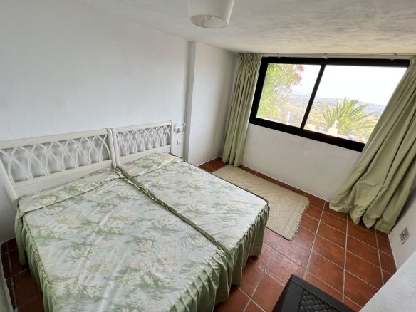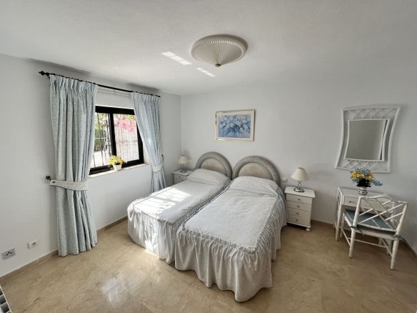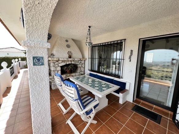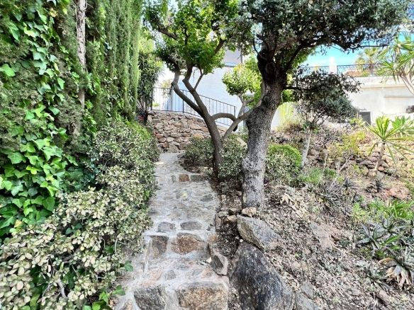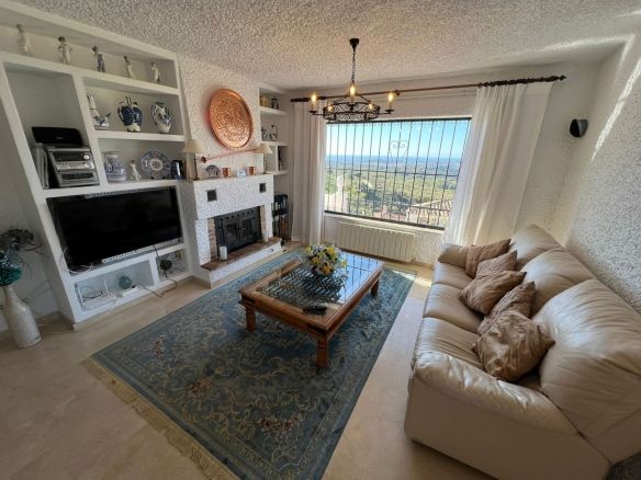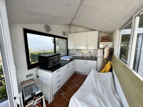 To the back of the kitchen, via stable doors, is access to a delightful and spacious courtyard with a cactus garden, a large tiled wall mural, and additional storage and access to the garage. Returning to the villa, there is a Master bedroom with fitted bespoke furniture, a walk-in dressing room, and an en suite bathroom. There is also access to the terrace. Off the dining area is a lovely covered terrace with fabulous views including built-in seating with a marble-topped table and steps leading to the garden and pool. From this terrace is a lift with direct access to the level below.