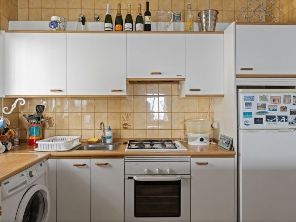Suddenly the corridor opens up and the sea appears. The kitchen, dining and sitting areas flow as one light-filled space, so the cook can chat with guests without losing sight of the blue horizon beyond the patio doors. Stone-effect worktops, full-height cabinets and a breakfast bar keep the kitchen smart and practical, while split-unit air-conditioning, a ceiling fan and a modern pellet stove ensure year-round comfort. Fibre broadband and a satellite-ready TV point are already in place.
