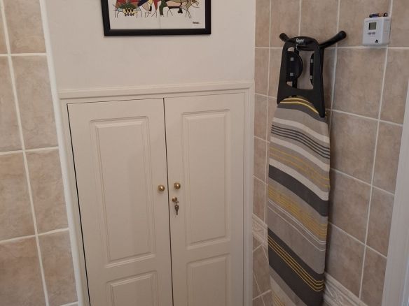 Two bathrooms, one upstairs where you enter the house and where the two bedrooms are and one downstairs