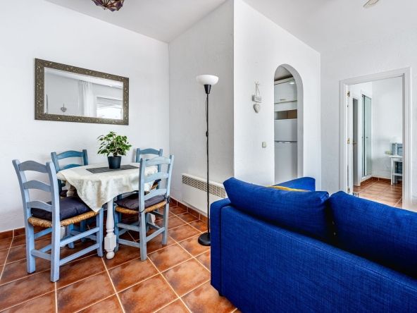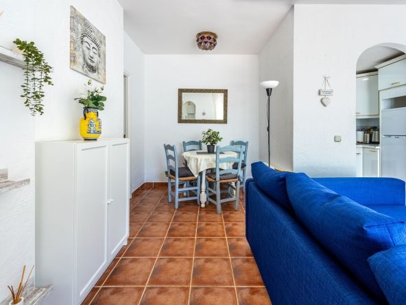 The open-plan living and dining area retains a warm, inviting atmosphere, enhanced by traditional finishes and natural light. The living room leads on to a small terrace, with enough space for a small table and chairs to enjoy the evening breeze.