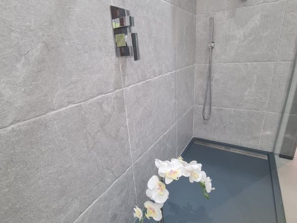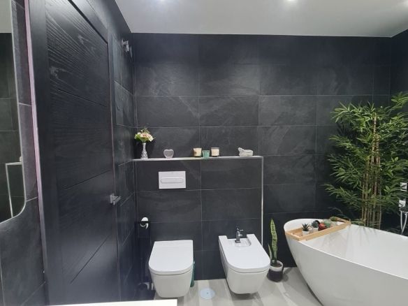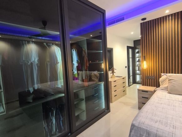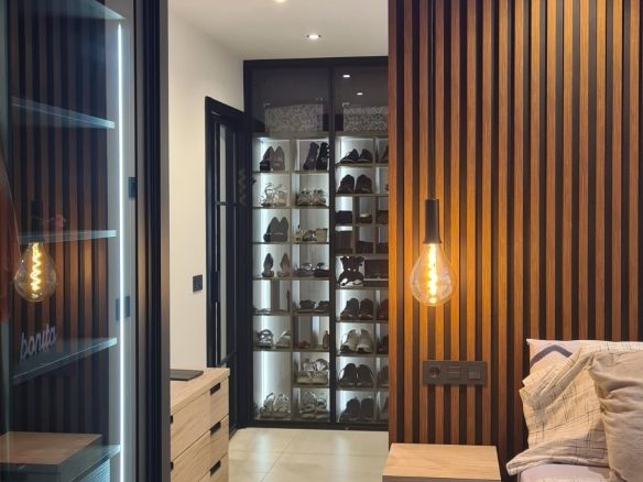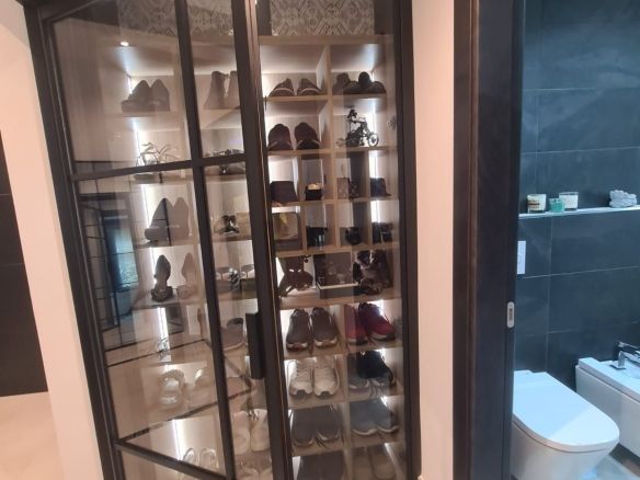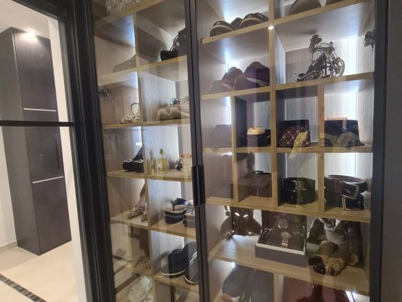 Master suite with dark glass illuminated wardrobe and shoe organiser. Modern bathroom with elegant bathtub and walk-in shower.