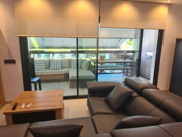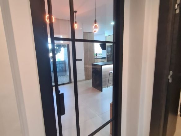 Spacious living-dining room that connects directly to a semi-open kitchen and leads to a covered seating area where you can enjoy the views even from an integrated jacuzzi. The suspended fireplace and décor create a very sophisticated atmosphere.
