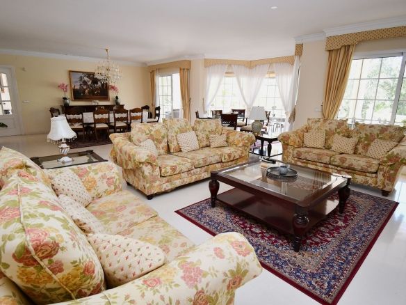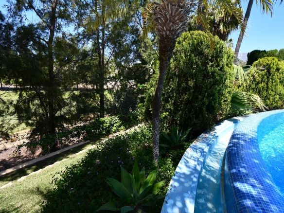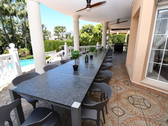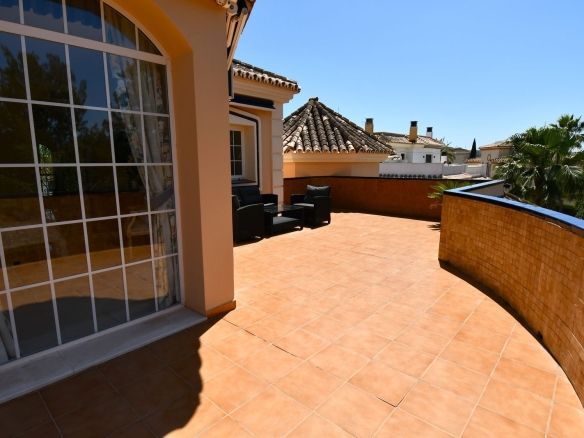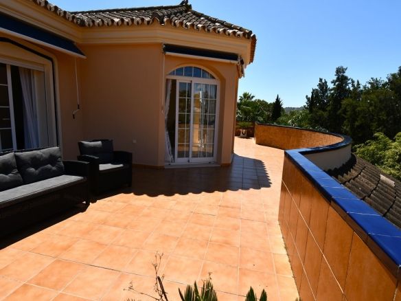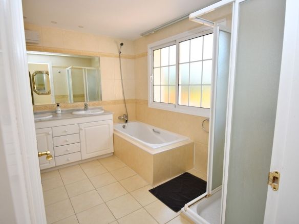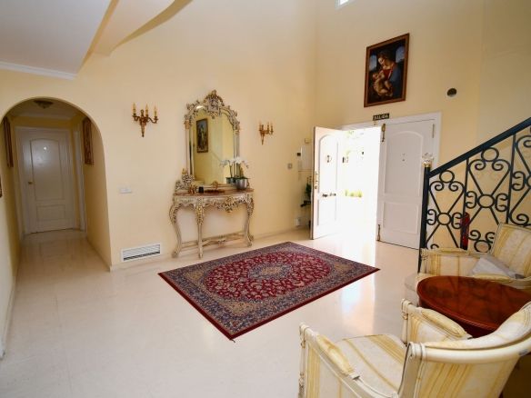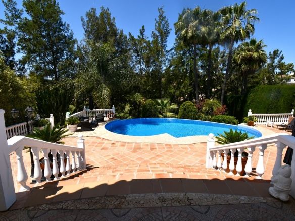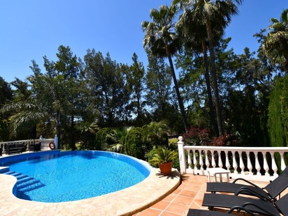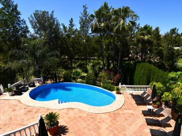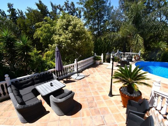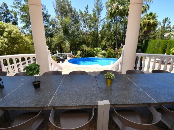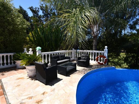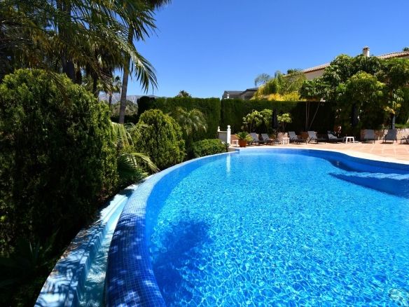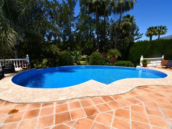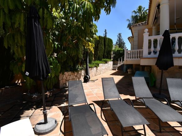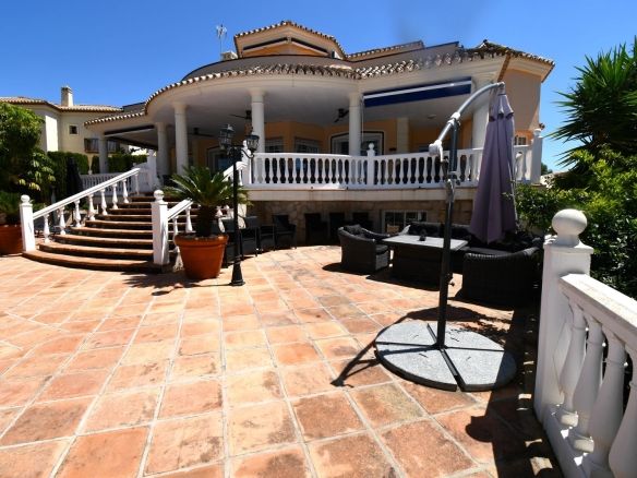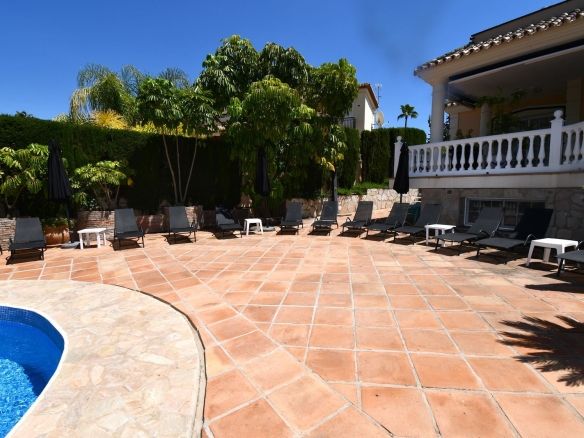 The villa is in the sort after area of Mijas Golf and has views of the beautiful Mijas Mountains.  The gardens surround the villa offering plenty of outside space.  There is a large terrace overlooking the pool.  This terrace offers plenty of seating and a BBQ area.  From the terrace, a staircase takes you down to the lower terrace and the pool area.  The pool is heated, so ideal for the cooler months.  The terrace surrounding the pool is made up of a large sunbathing area, as well as seating areas.  Ideal to just relax and unwind.   From this level you will find stairs taking you down to the lawned garden.  Tropical plants and fruit trees complete this outdoor paradise.