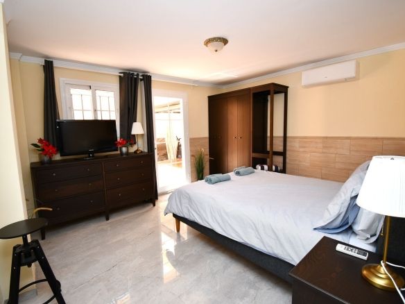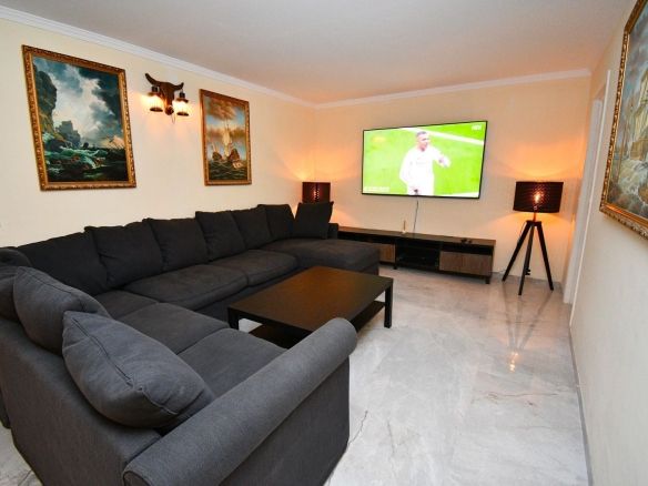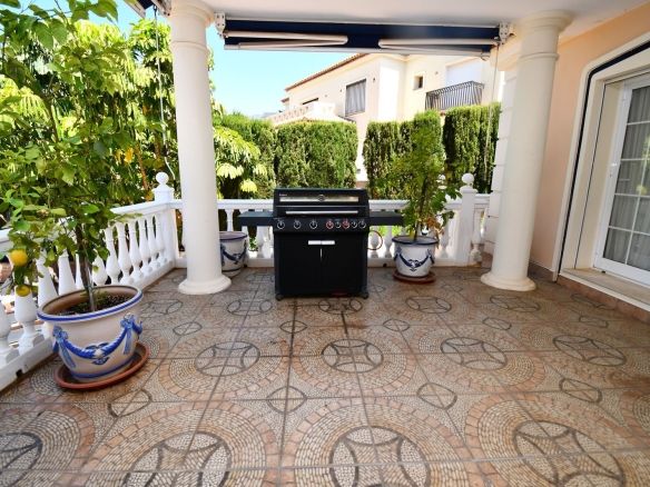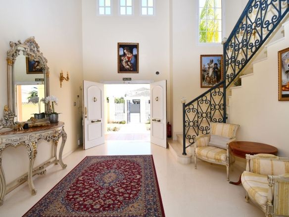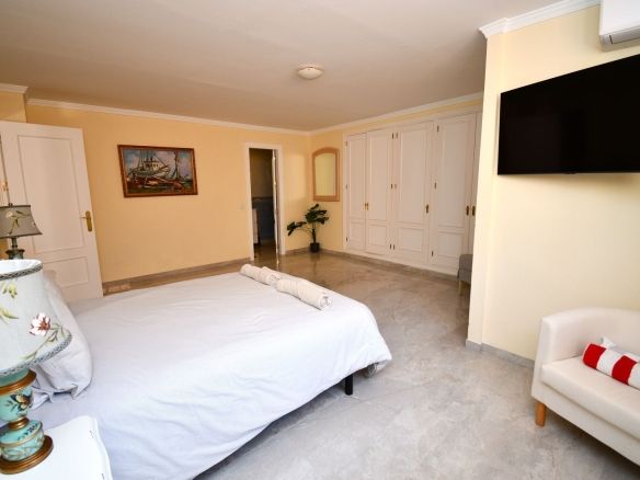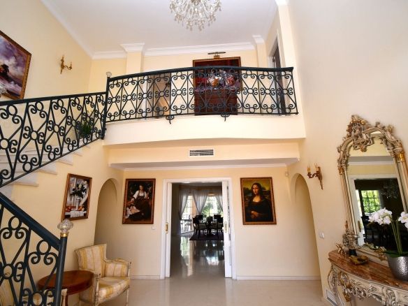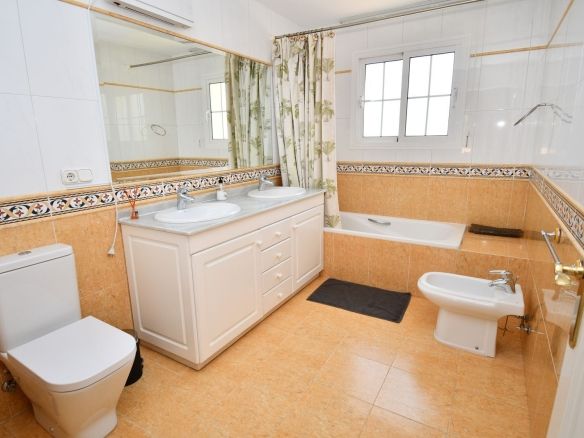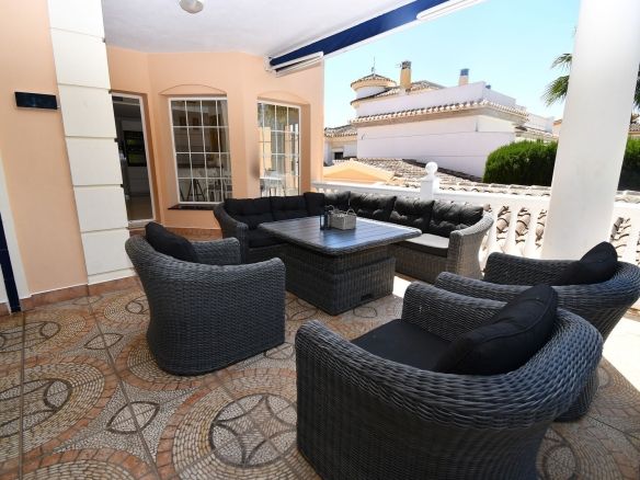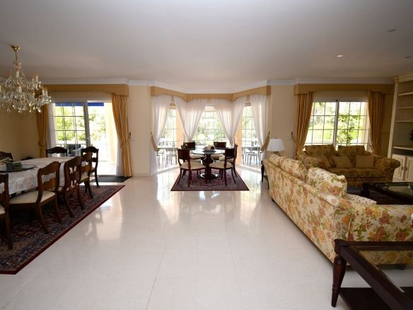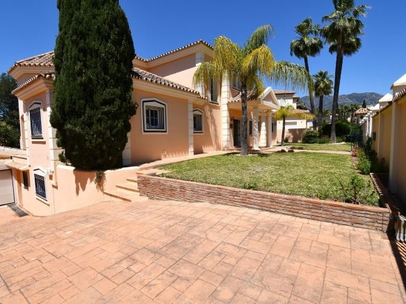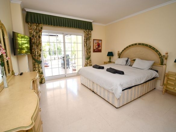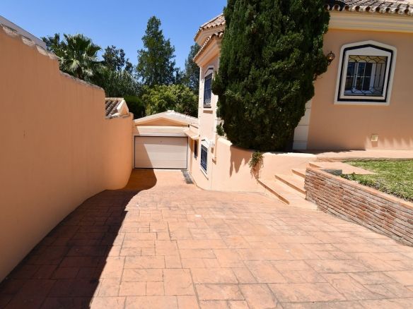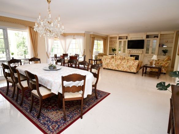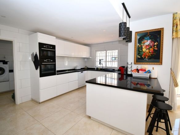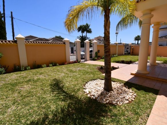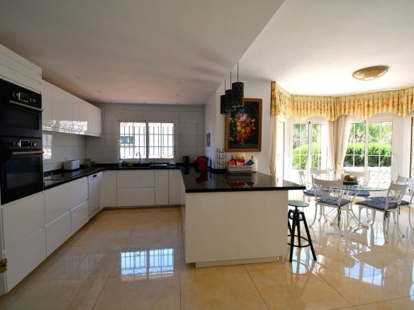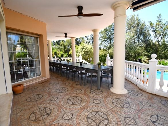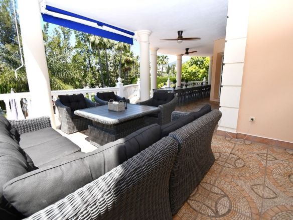 The villa is in the sort after area of Mijas Golf and has views of the beautiful Mijas Mountains.  The gardens surround the villa offering plenty of outside space.  There is a large terrace overlooking the pool.  This terrace offers plenty of seating and a BBQ area.  From the terrace, a staircase takes you down to the lower terrace and the pool area.  The pool is heated, so ideal for the cooler months.  The terrace surrounding the pool is made up of a large sunbathing area, as well as seating areas.  Ideal to just relax and unwind.   From this level you will find stairs taking you down to the lawned garden.  Tropical plants and fruit trees complete this outdoor paradise.