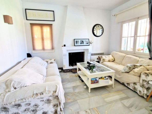 On the ground floor, the home features a fully fitted kitchen, a guest cloakroom, and a spacious lounge-dining area with a fireplace and air conditioning. From here, you can step out onto a sunny private terrace, ideal for relaxing or entertaining.