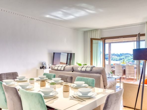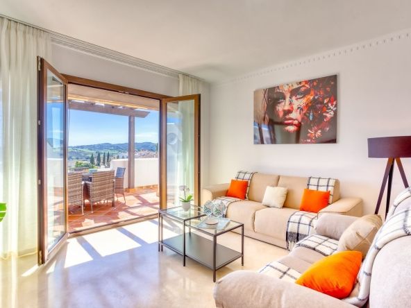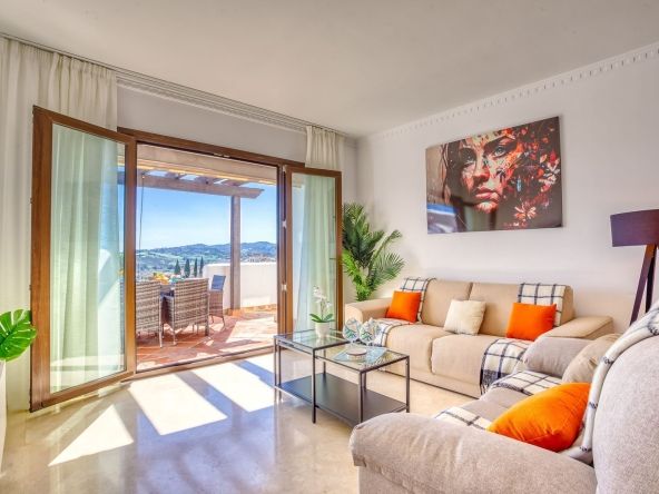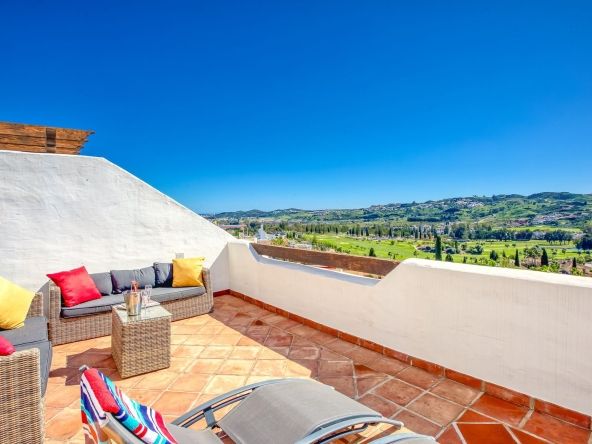 This south-facing penthouse boasts panoramic views over the lush fairways of Mijas Golf and the surrounding mountain range. Enjoy sun-drenched terraces and a peaceful setting, all within easy reach of local amenities.