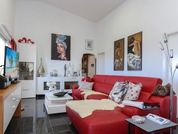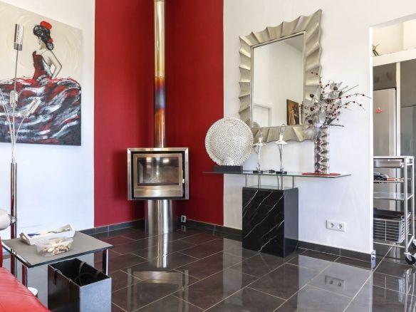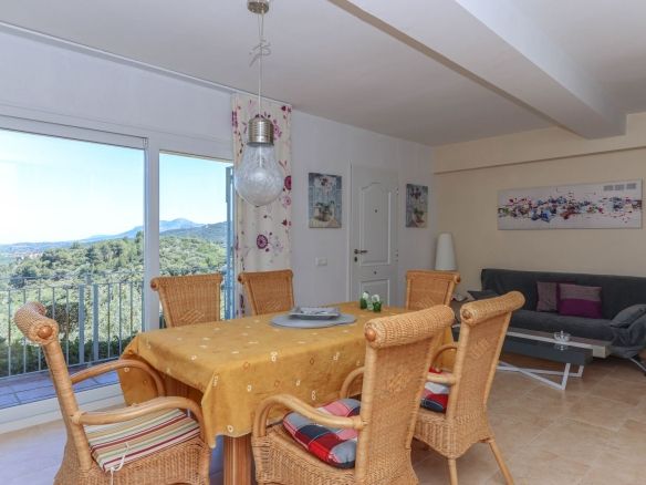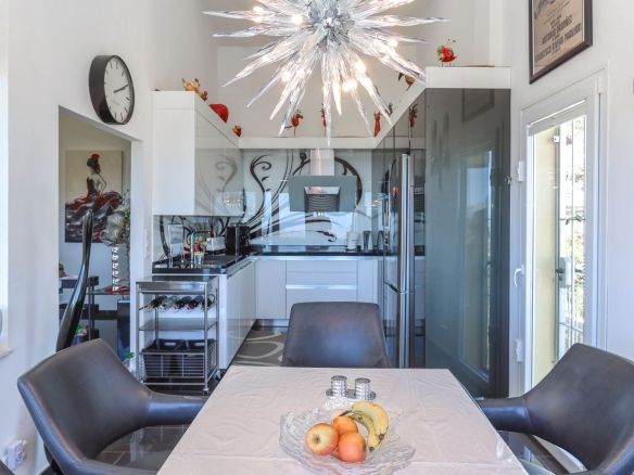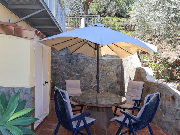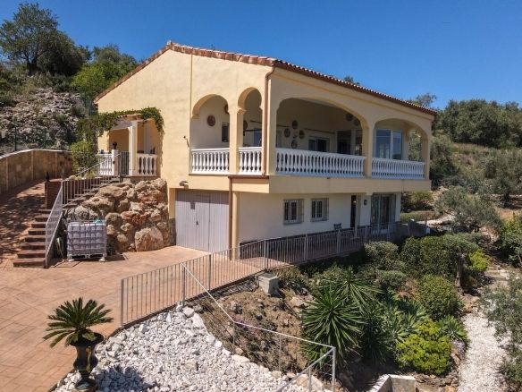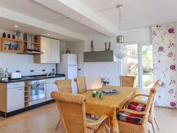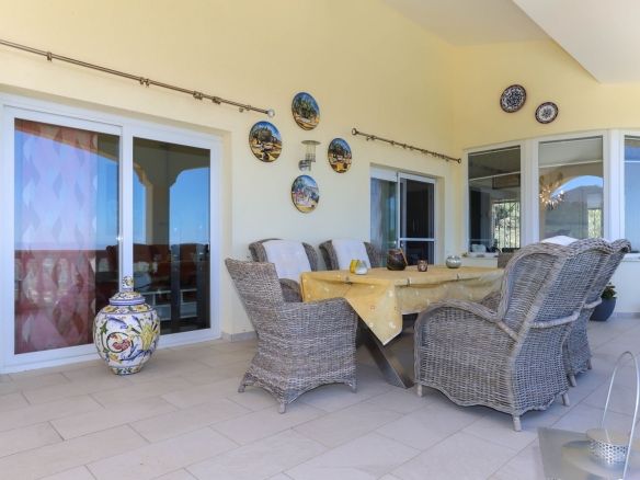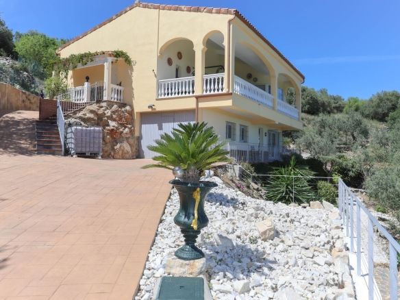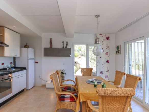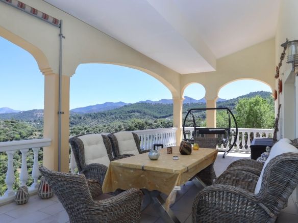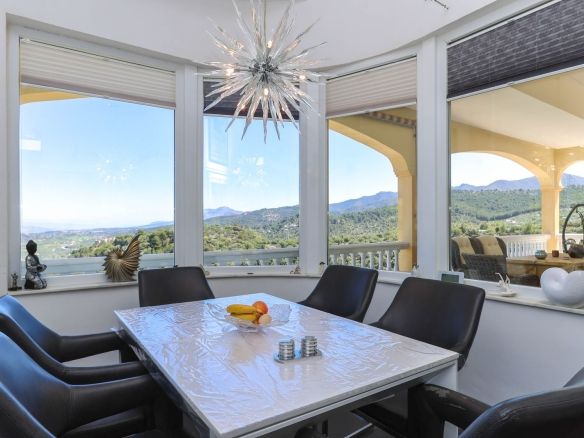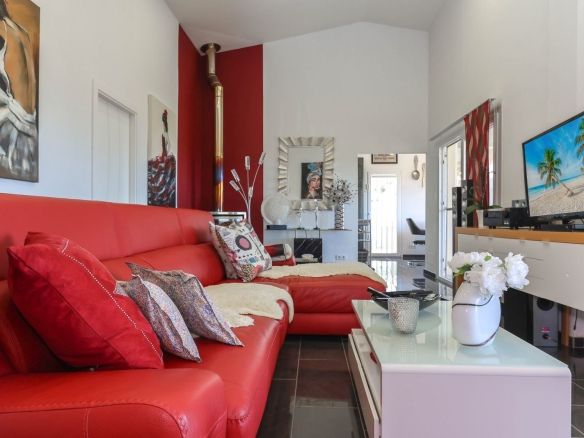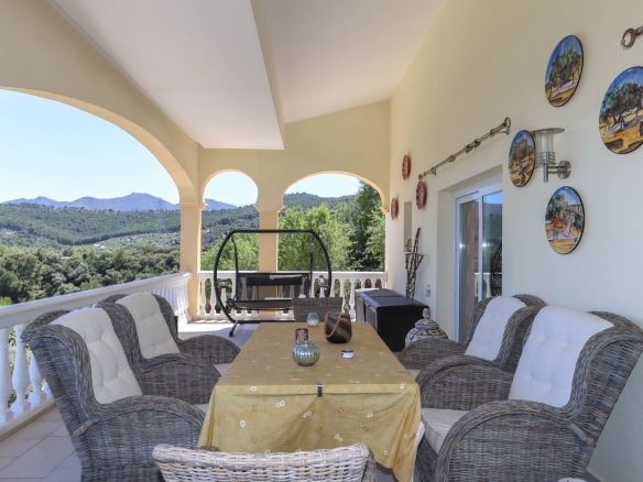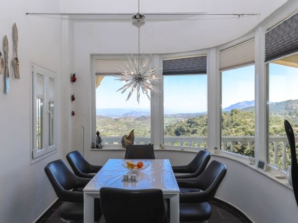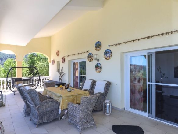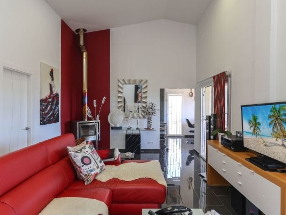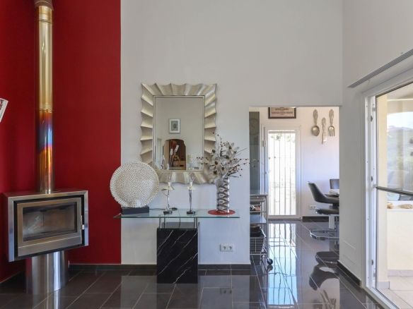 The house is built on two levels. The main accommodation is located on the the top level with the separate apartment sitting below. A staircase leads upto the front door with access to the rear shady terrace. Entering into the Villa you are immediatley impressed by the quality of the finish. To the right is the guest bathroom and to the left Bedrooms 3. Walking from the hallway into the bright lounge with high ceilings and two sets of patio doors the room feels light, airy and welcoming. A wood burning stove is located in the corner to provide winter heat. Both set of patio doors lead to the large covered terrace which sits to the front of the property, this is the most wonderful spot to sit and relax and enjoy the beautiful views.