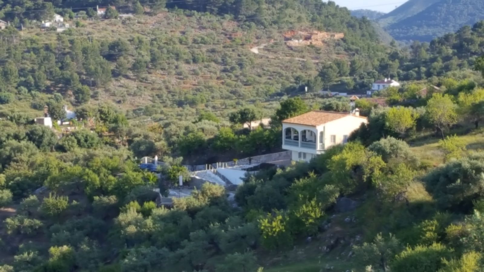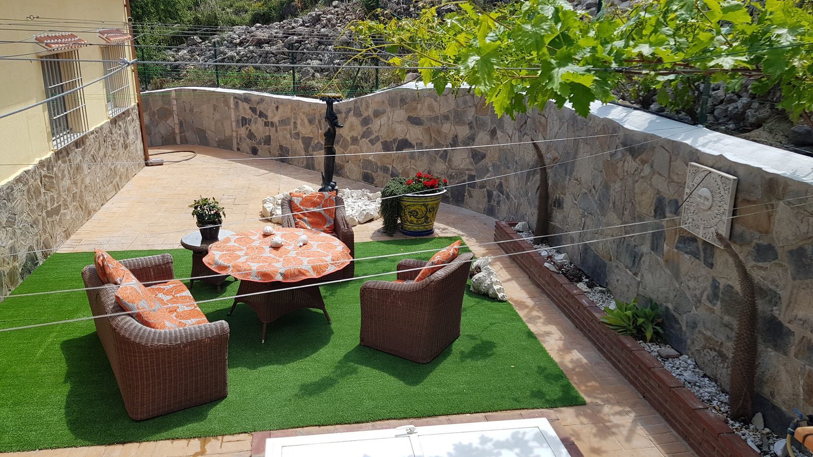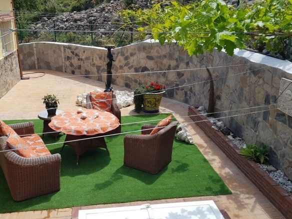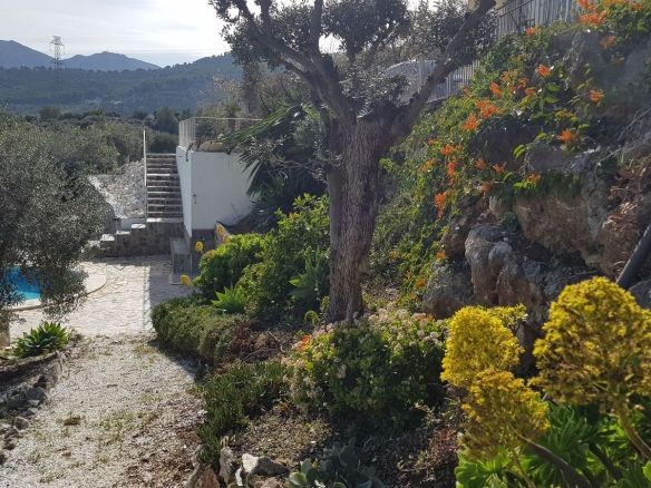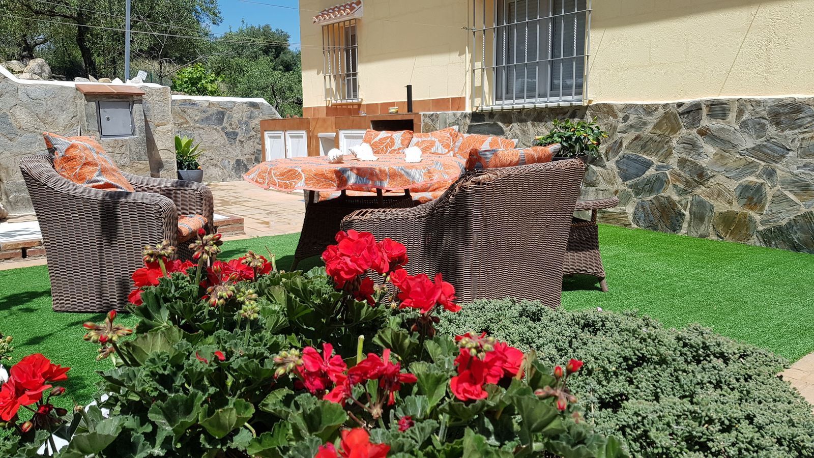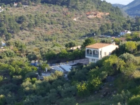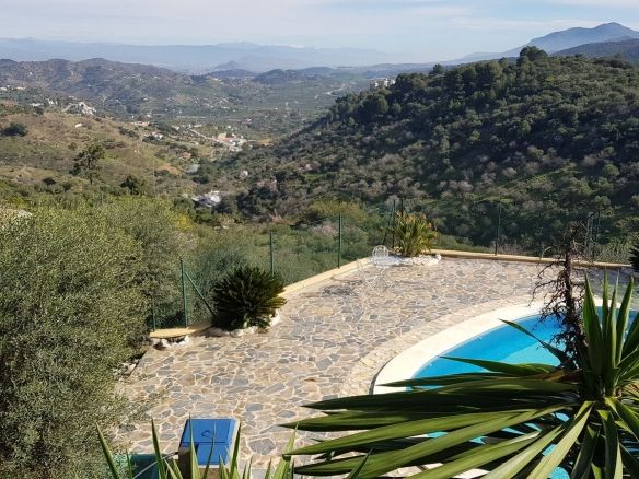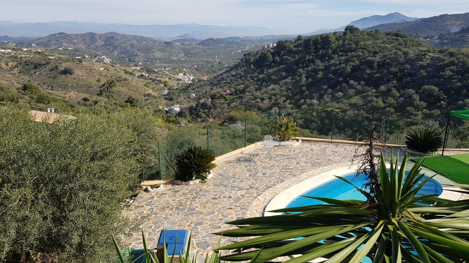 This beautiful country house – built in 2012 – has a large garage with workshop (approx. 45 m²), a guest flat (approx. 45 m²) with living room and open-plan kitchen, a shower room and a separate large terrace. The living space is approx. 90 m². There are 2 bedrooms and 2 bathrooms (one en-suite) and an open-plan kitchen – very smart and only 3 years old. A large terrace of approx. 30 m² with marvellous views of the mountains as far as Málaga and the Sierra Nevada is accessible from the living room, another terrace is located behind the building. There is a private well and a large underground tank with a capacity of 11,000 litres for drinking water in case the groundwater is insufficient. A small pool – not heated, no air conditioning and no heating – just a fireplace in the living room. The plot measures approx. 3,500 square metres and is planted with olive trees, lemon trees, vines, almond trees, etc.