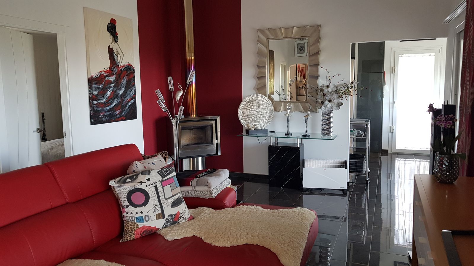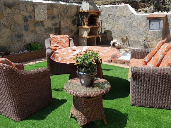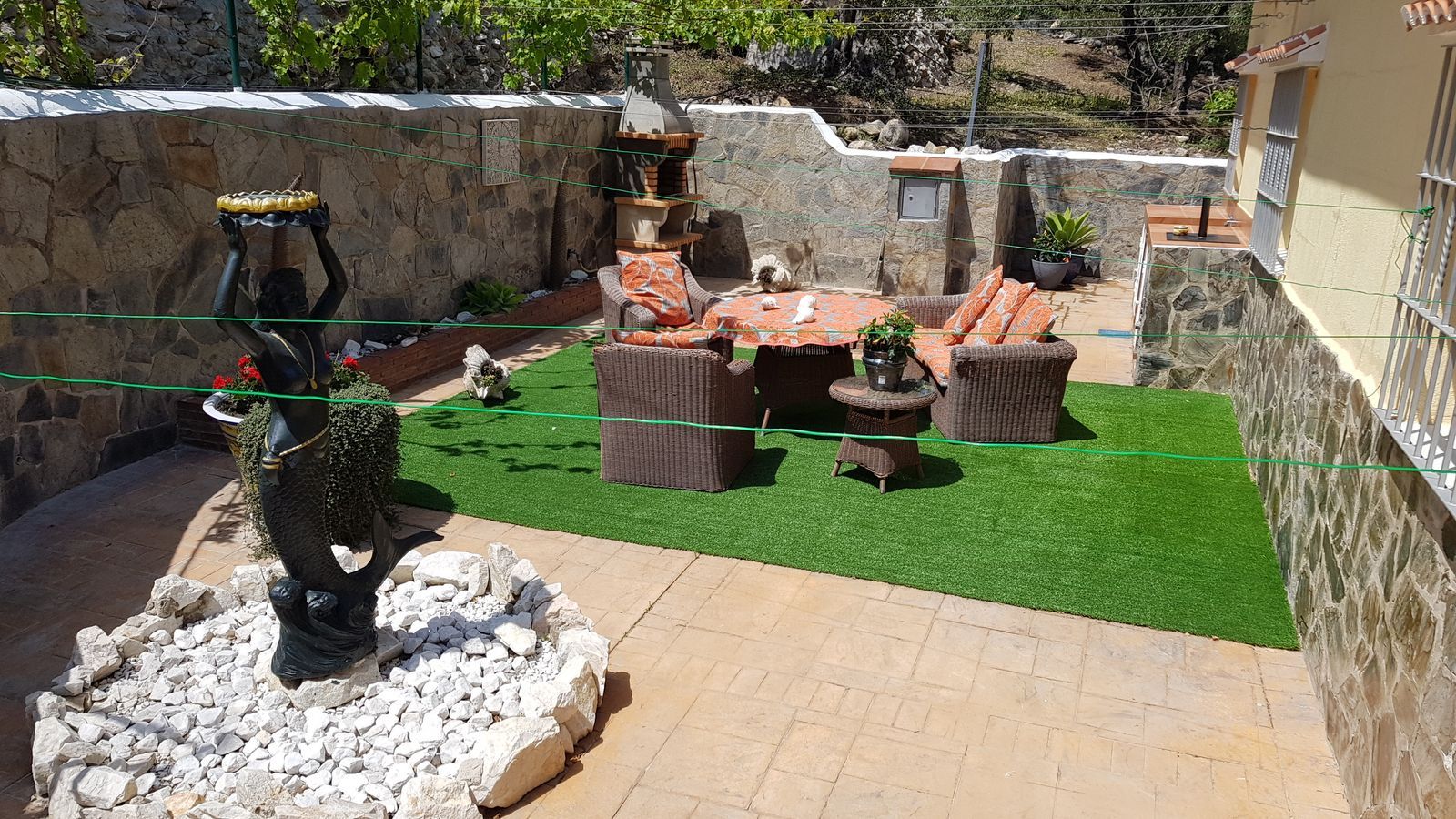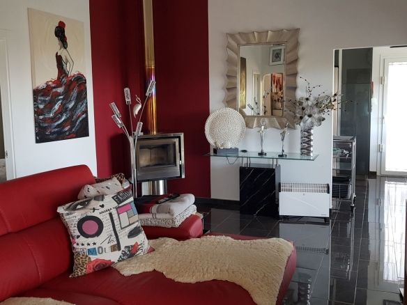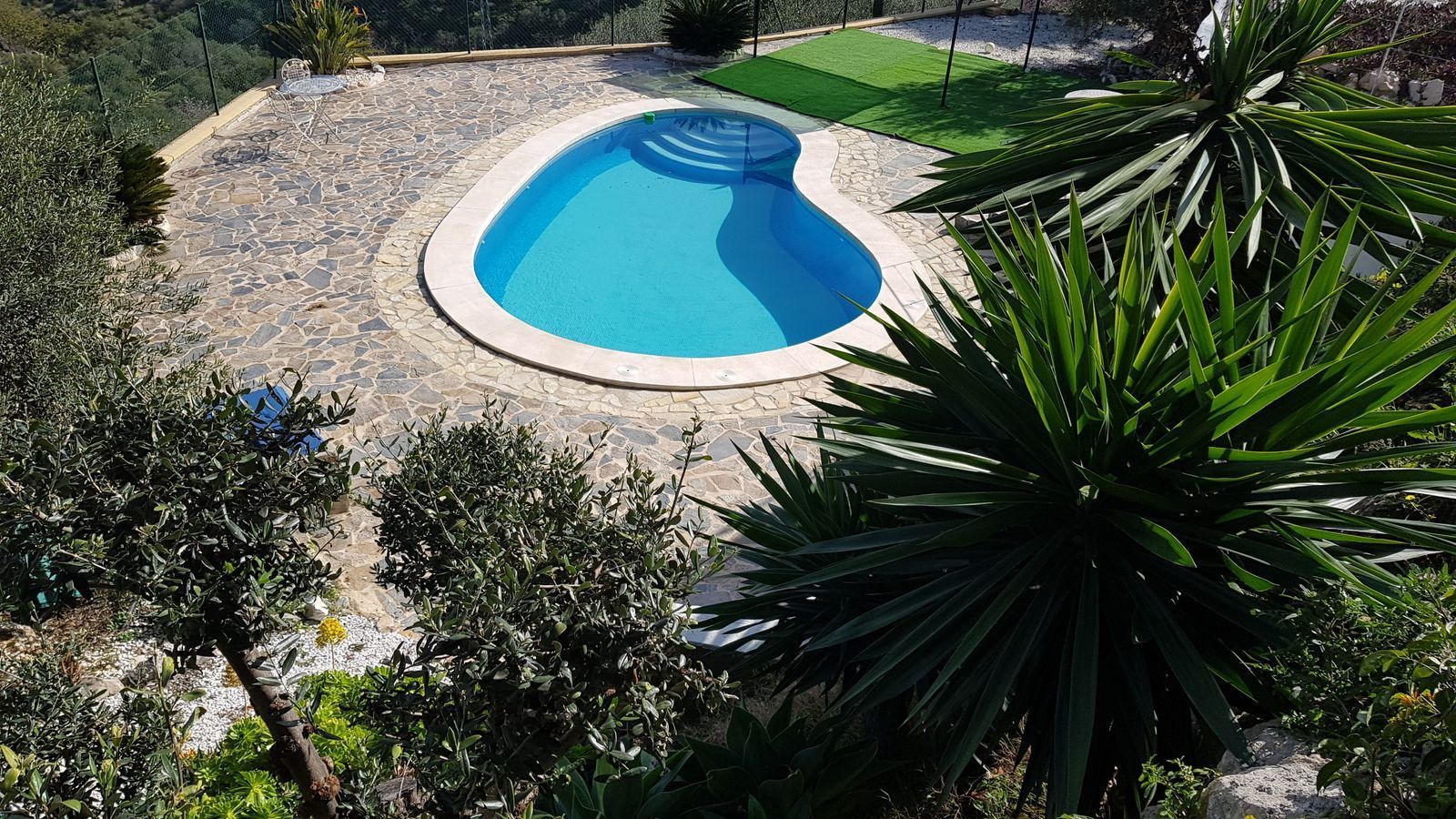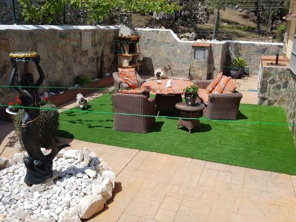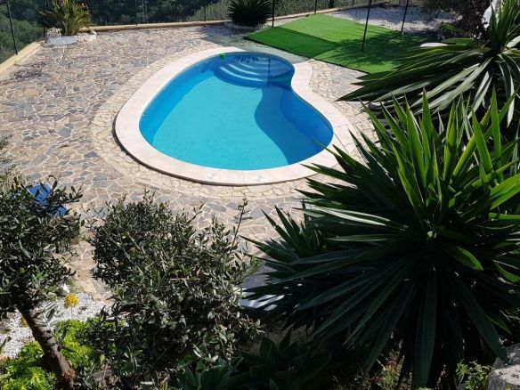 This beautiful country house – built in 2012 – has a large garage with workshop (approx. 45 m²), a guest flat (approx. 45 m²) with living room and open-plan kitchen, a shower room and a separate large terrace. The living space is approx. 90 m². There are 2 bedrooms and 2 bathrooms (one en-suite) and an open-plan kitchen – very smart and only 3 years old. A large terrace of approx. 30 m² with marvellous views of the mountains as far as Málaga and the Sierra Nevada is accessible from the living room, another terrace is located behind the building. There is a private well and a large underground tank with a capacity of 11,000 litres for drinking water in case the groundwater is insufficient. A small pool – not heated, no air conditioning and no heating – just a fireplace in the living room. The plot measures approx. 3,500 square metres and is planted with olive trees, lemon trees, vines, almond trees, etc.