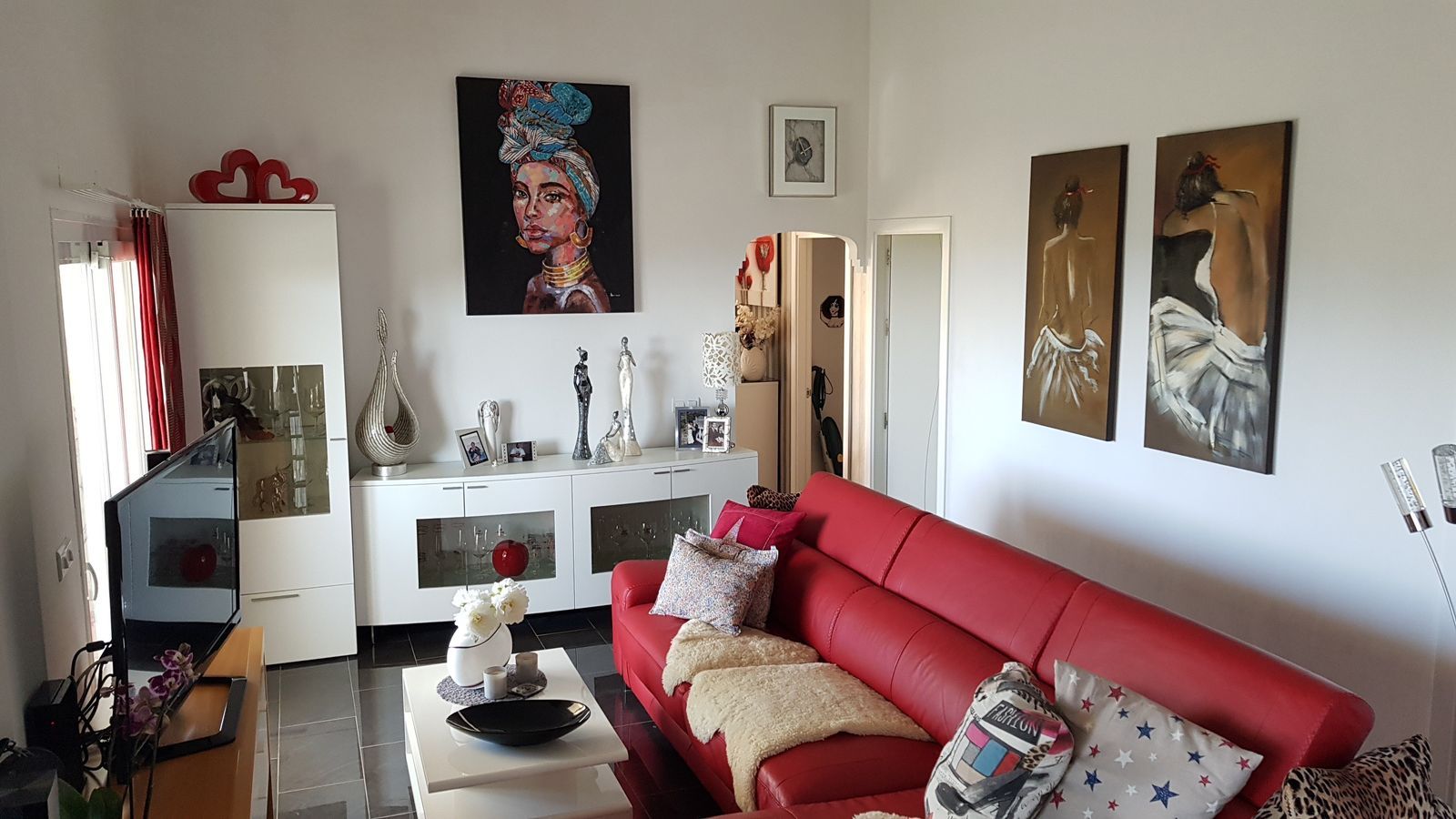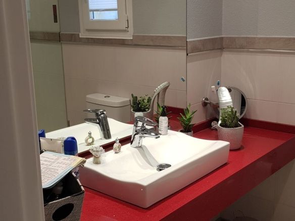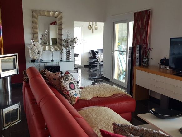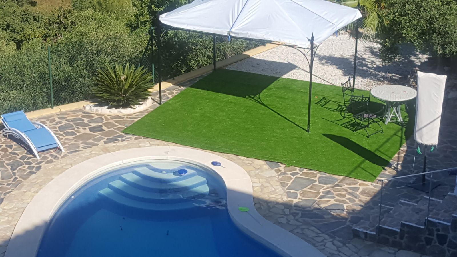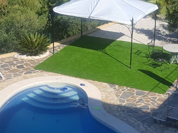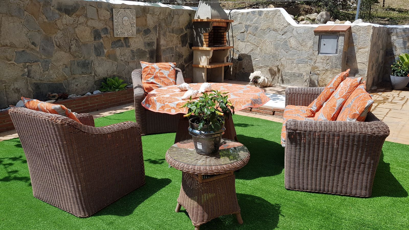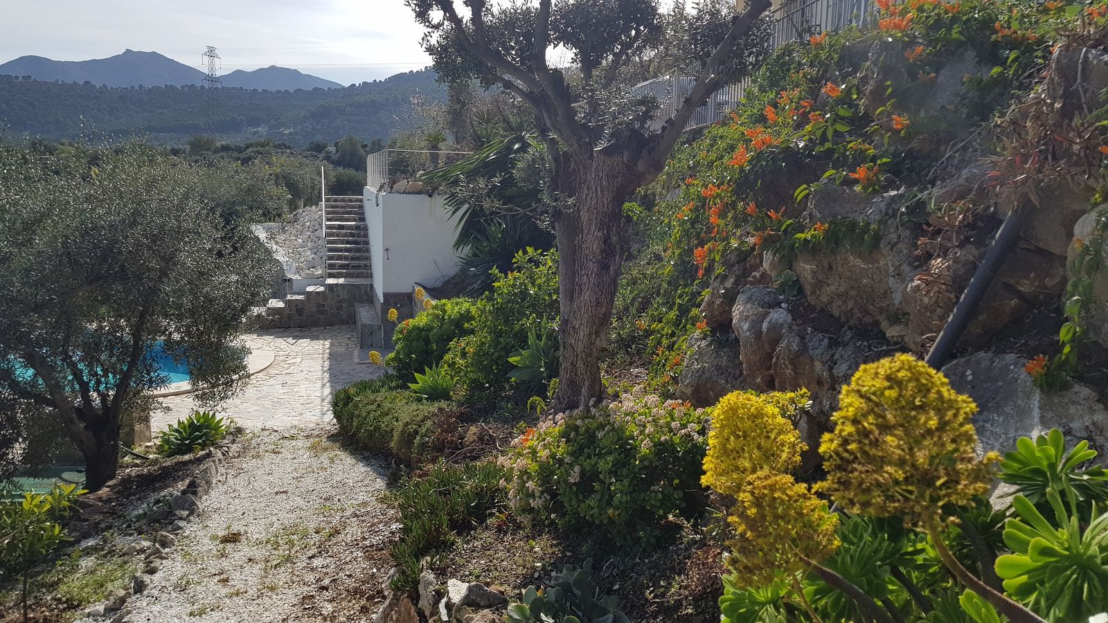 This beautiful country house – built in 2012 – has a large garage with workshop (approx. 45 m²), a guest flat (approx. 45 m²) with living room and open-plan kitchen, a shower room and a separate large terrace. The living space is approx. 90 m². There are 2 bedrooms and 2 bathrooms (one en-suite) and an open-plan kitchen – very smart and only 3 years old. A large terrace of approx. 30 m² with marvellous views of the mountains as far as Málaga and the Sierra Nevada is accessible from the living room, another terrace is located behind the building. There is a private well and a large underground tank with a capacity of 11,000 litres for drinking water in case the groundwater is insufficient. A small pool – not heated, no air conditioning and no heating – just a fireplace in the living room. The plot measures approx. 3,500 square metres and is planted with olive trees, lemon trees, vines, almond trees, etc.