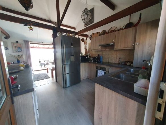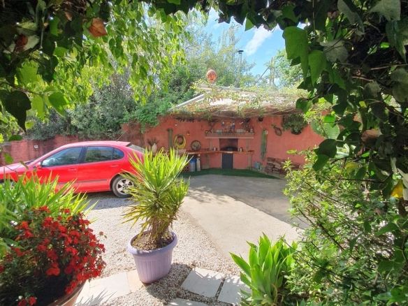 The house features three well-proportioned bedrooms and a stylish shower room. The spacious lounge boasts high ceilings and a cosy wood burner, creating a warm and inviting atmosphere. Air conditioning and double glazing throughout ensure comfort all year round.